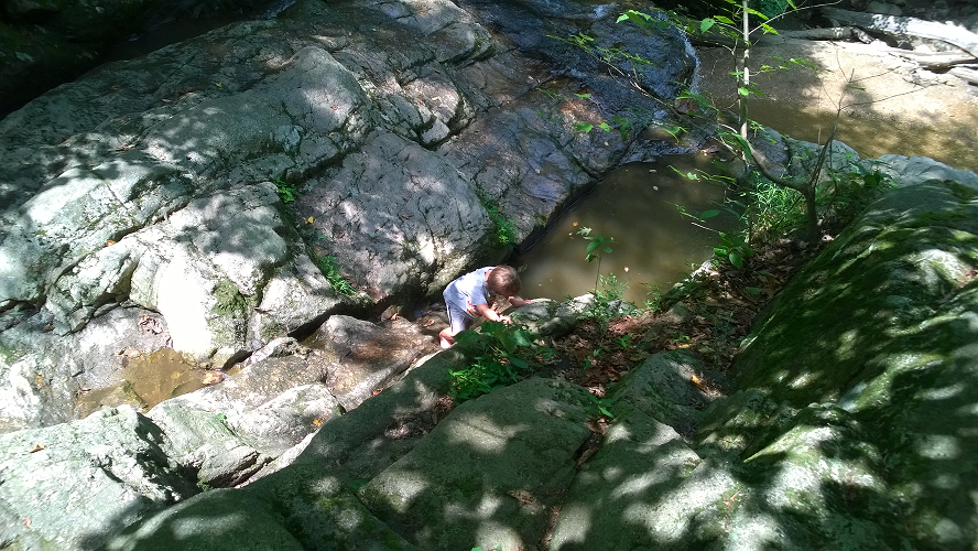 The kids were having a great time clambering around on the rocks and wading in the water and at this point I was feeling Pretty Darn Smug. Our quiet time was soon shattered however, by a large group of moms and boys coming down the trail from the other direction.