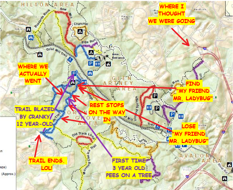 I checked the map on the web site and noted the name of the area we were trying to get to– it had “multiple stream crossings” which sounded perfect because it’s hot as balls outside.