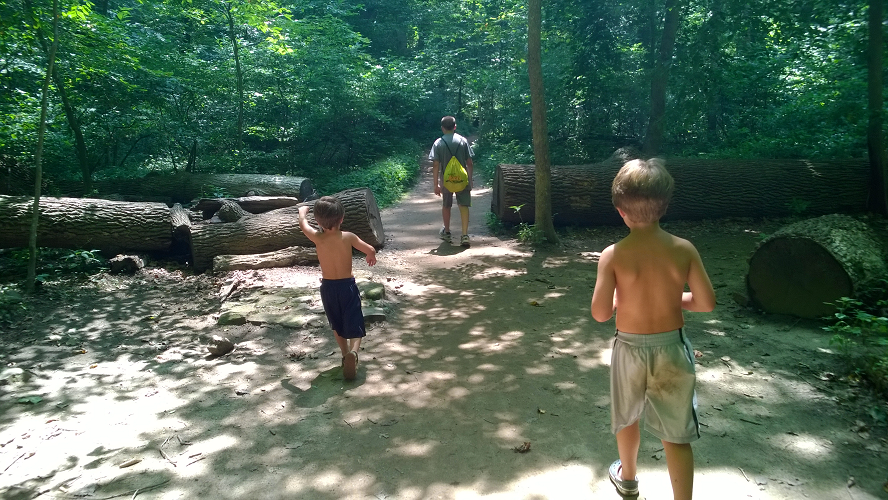 By this time, the 3 year old had started to crash as well. We headed back into the woods a short way and found a spot to take a break. I fished out the leftovers from lunch out of my backpack and we all drank some water. Oldest Son has resigned himself to marching back to the car as quickly as possible. He drained his water bottle and half of mine while we’re sitting there.