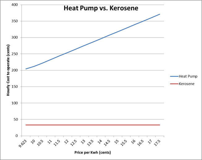 At Baltimore Gas and Electric’s current rate (9.623 cents per Kwh), my heat pump costs me $2 for every hour it’s running. That is more than 6 times the cost of an hour of heat out of the Kerosene heater. As the rates go up, it just gets more absurd. I mean, no one would really be paying 17.5 cents per kwh, right? That’s almost double what BGE charges…